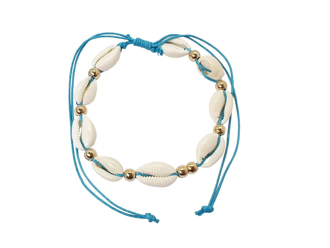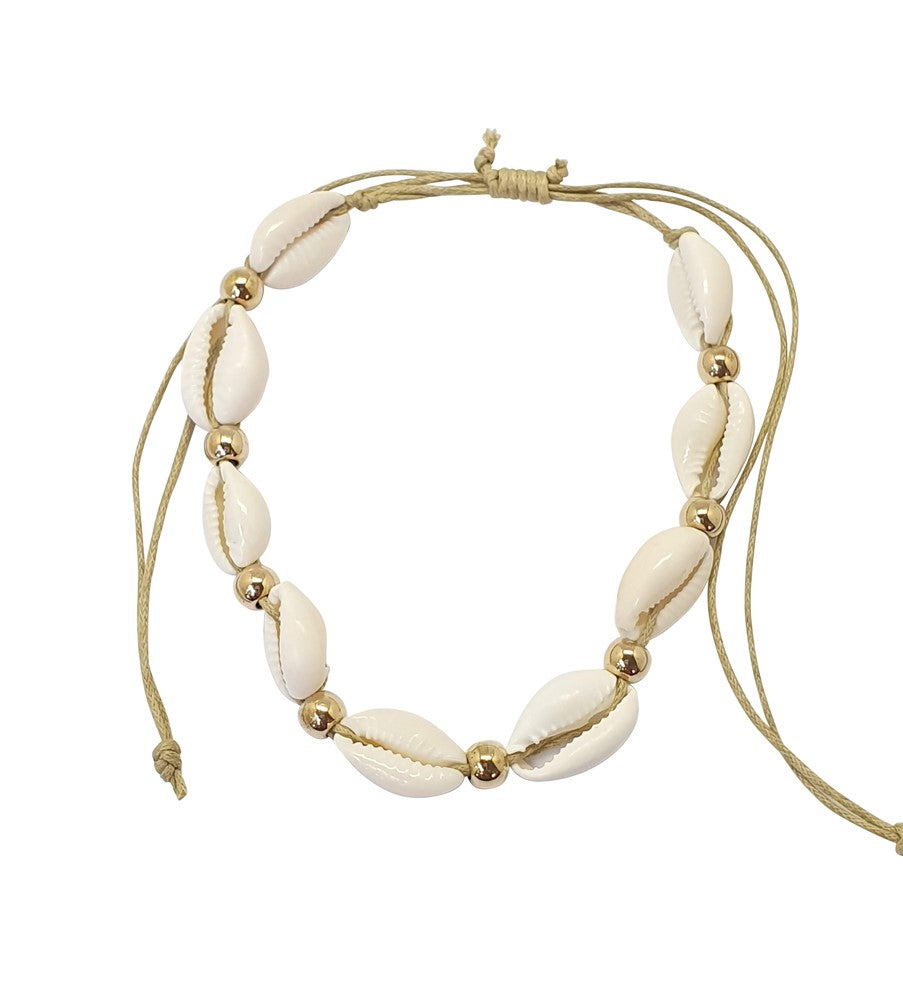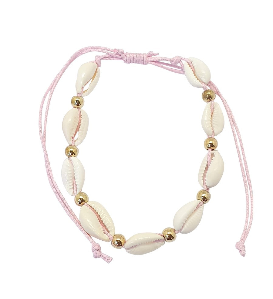 "Add a touch of the sea to your summer look with our A63 anklet! Uniquely designed with 9 cowrie shells and metal beads, this slipknot anklet exudes a natural and beachy vibe. Adjust it to your perfect fit and effortlessly elevate any outfit. Available in Pink, Turquoise, and Beige. RRP $7.99."