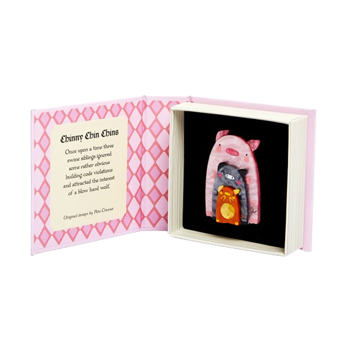 Add a whimsical touch to any outfit with the Chinny Chin Chin Erstwilder Brooch. Part of the Pete Cromer Erstwilder Jewellery Fairy tale collection, this playful accessory tells the story of three sibling pigs who built their homes without following the rules, only to face a huffing and puffing wolf. A must-have for fairy tale lovers and jewelry enthusiasts alike!
