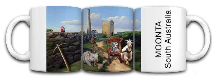 Get your caffeine fix as you dig into your day with this quirky coffee mug design by G Thompson featuring Little Digger and friends at the historic Moonta hughes Cornish mine engine house. A playful and unique addition to your morning routine. showcasing a cute wombat with a Cornish pixie Goat Cart With Koala ,Kangaroo ,Galah & the Moonta Hughes Cornish mine engine pump house. A whimical Souviner reminder of your trip to Moonta South Australia .