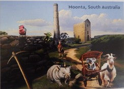 Meet Little Digger the Wombat,and his friends a charming souvenir of Moonta South Australia a superb addition to your fridge collection! This Australian-made magnet features a witty play on words, showcasing a cute wombat with a Cornish pixie Goat Cart With Koala ,Kangaroo ,Galah Moonta Hughes Cornish mine engine punp house. Sprinkle some whimsy into your kitchen with this quirky magnet.