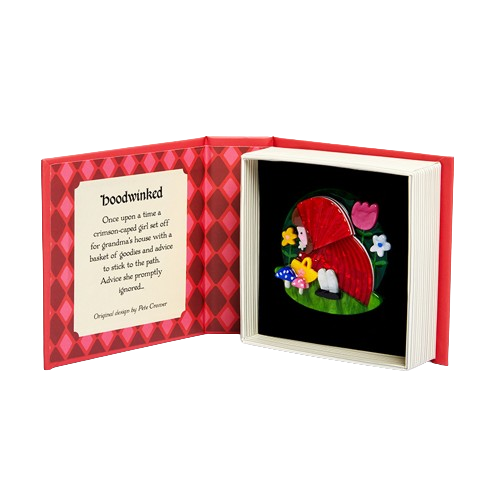 story :Hoodwinked Erstwilder brooch Part of the Pete Cromer Fairy Tail Collection once apon a time a crimson caped girl set off for grandmas house with a basket of goodies and advice to stick to the p;ath Advice he promptly ignored