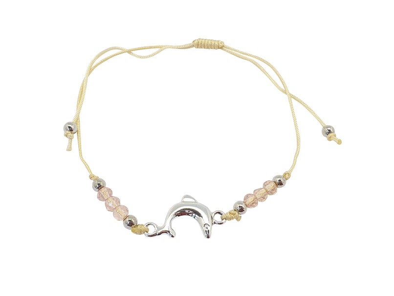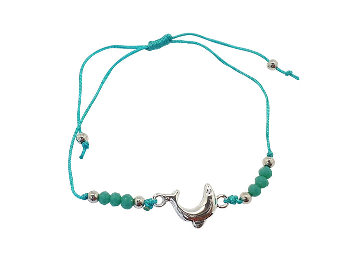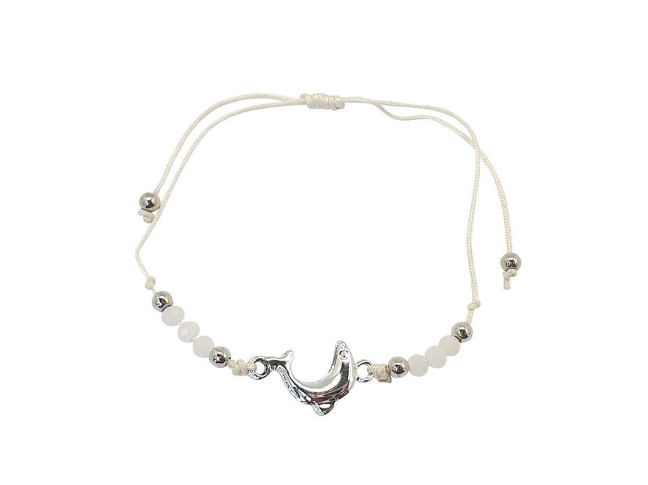 "Add a touch of whimsy to your style with our NB11 Bracelet Cotton! Featuring a charming dolphin charm accented with glass and metallic beads, this bracelet is perfect for any ocean lover. The adjustable slipknot closure ensures a comfortable fit. Available in aqua, cream, and white."